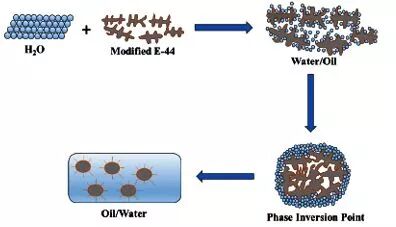 外加乳化法是在高速分散下将环氧树脂与乳化剂均匀混合,之后缓慢地向体系中加入水,使得整个体系逐渐由油包水型相反转成水包油型,进而形成稳定的水性环氧乳液。