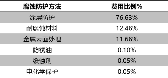从上面的图表费用比例我们能够看出,我国在涂层防护方法上投入的资金较多,也就是说,涂层防护是目前最主要的腐蚀防护方法。这是因为涂层防护能够避免基体表面与空气、水等腐蚀性环境直接接触,从而达到腐蚀的目的。